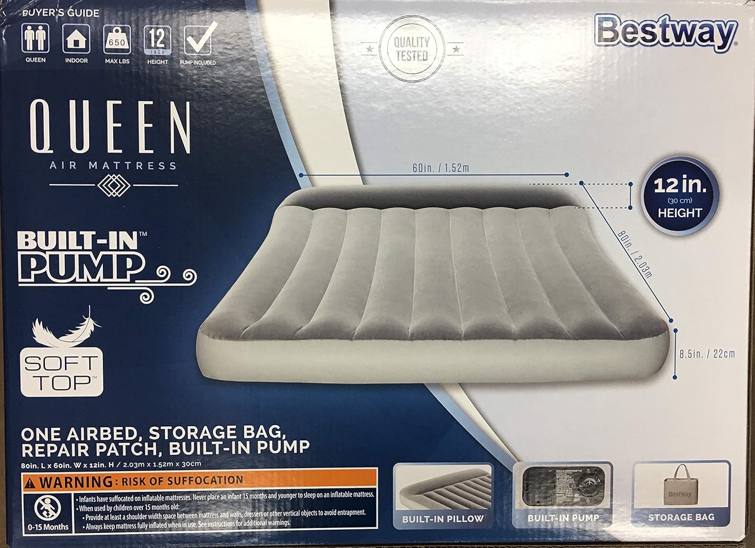 Provide traveling guests or yourself a place to sleep for the night with the bestway air mattress with built in ac pump. Comfort quest queen air mattress with built in pump for guest dark blue. This mattress is 12 inches high on the built in pillow area but 9 inches high on the part you sleep on. 4 4 out of 5 stars 1 107.
